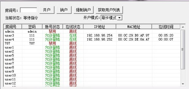 6.支持显示当前所有账号状态,包括帐号名,密码,账号状态,在线状态,IP地址,MAC地址,在线时间。