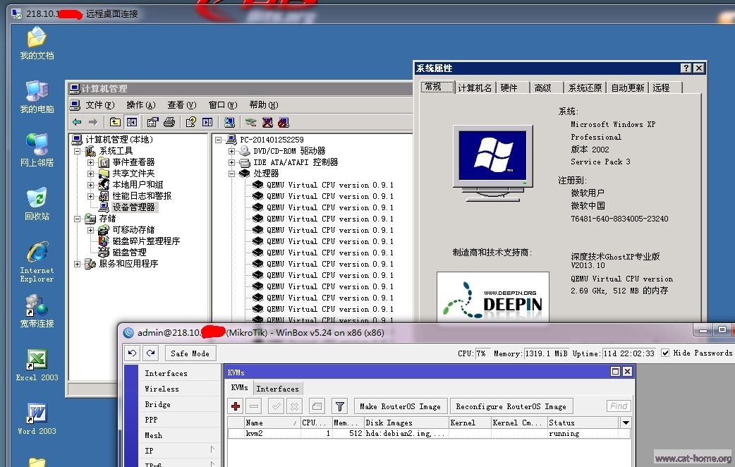 ROS5.24内利用KVM实测运行XP成功,运行本人用debian封装的radius manager3.9系统也一切正常。但是debian7运行失败,目测有2个原因,grub和kernel,由于需求不大,暂不处理。运行的稳定性正在测试。