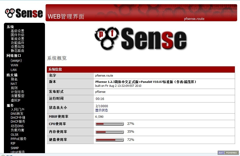 PFS采用 pfsense 1.2.3正式版(FREEBSD7.2内核)
