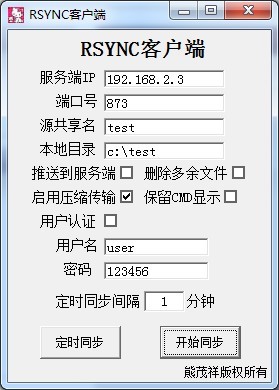 更新内容:支持程序和RSYNC组件存放在任意目录下运行。(包含中文目录)支持RSYNC设置为中文目录并提供同步服务。添加客户端定时同步功能。添加缩小到托盘功能。
