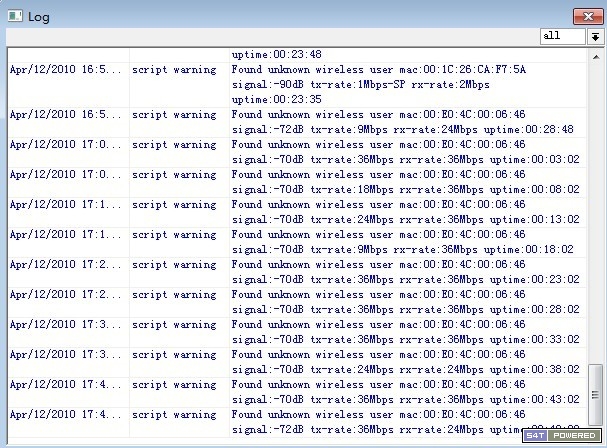 :local f ("Found unknown wireless user" . " mac:" . $a . " signal:" . $b . " tx-rate:" . $c . " rx-rate:" . $d . " uptime:" . $e)